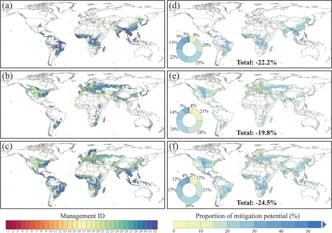 空间优化养分管理的减排潜力:空间优化的养分管理策略(即每个网格单元选择最适合其条件的组合)能够在不改变总氮肥投入的情况下,将全球氮径流减少0.52 Tg N yr⁻¹,相当于当前排放总量的22.2%。优化策略呈现出强烈的空间异质性:增效肥料-深施-一次施用-秸秆还田的组合在水稻和玉米的优化网格中占比最高(35%-36%);而对于小麦,该组合与“有机肥-深施-一次施用-秸秆还田”的组合并重。从具体措施来看,增效肥料和有机肥在超过99%的旱地作物网格中被选为最优;秸秆还田和深施在超过80%的网格中被优先选择;而一次施肥则比多次施用更普遍。减排潜力主要分布在亚洲、北美和欧洲,其中玉米的减排潜力最大(0.22 Tg N yr⁻¹)。