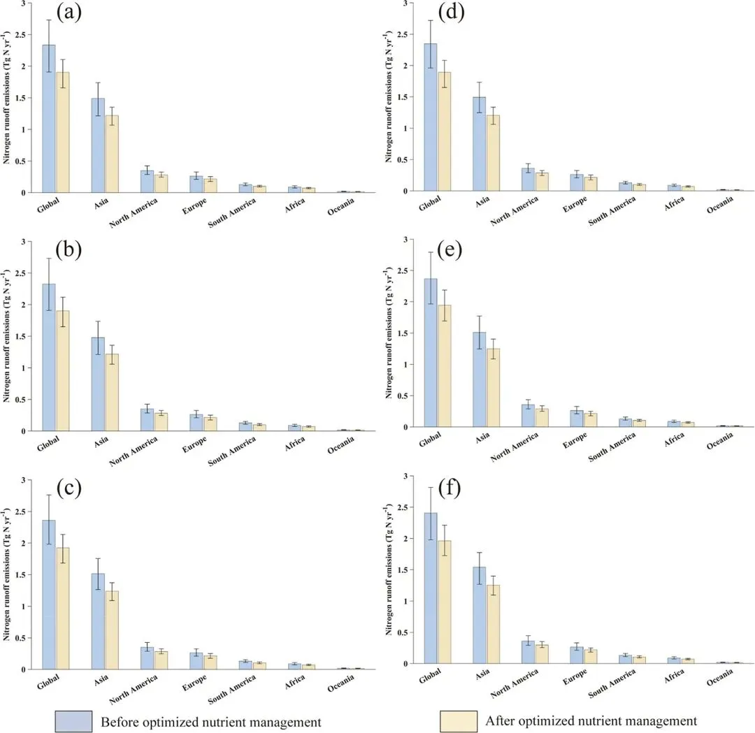 优化策略对未来气候变化的韧性:未来气候变化将导致全球氮径流增加,尤其是在高排放情景SSP5-8.5下,到2100年预计将增加3.2%。然而,即使在最严峻的气候变化情景下,采用空间优化的养分管理策略仍能持续减少氮径流,全球范围内的减排幅度维持在17.6%至19.2%之间。这意味着,仅需实现优化策略减排潜力的大约五分之一,就足以完全抵消由气候变化带来的氮径流增加,证明了该策略的强韧性和有效性。