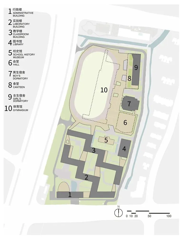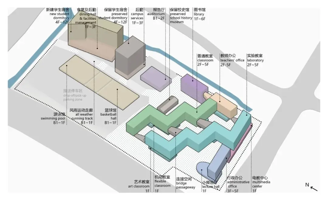 基于此现状,总平面规划以文保建筑及周边保留的大树作为核心景观,其南侧为教学办公区,北侧为生活运动区。北区西侧 400 米操场架空抬高,下方空间得以高效利用:临路一侧做家长可进入校园接送的停车区,减少对校门口道路的交通压力;中部为半下沉的游泳馆、训练馆、篮球馆以及风雨运动跑道,东侧为礼堂和食堂。架空操场之上,新旧两栋高层宿舍楼并置,与周边的高层住宅共同形成东高西低的城市肌理。师生课间登上操场,可获得在高密度环境中的远眺视野和放松的出口。