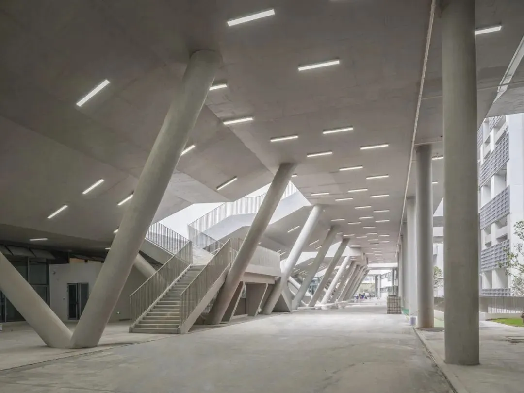 南区教学组团布局围绕文保建筑展开,建筑体量通过 Z 字弯折,形成五个半围合庭院。校园首层大量架空,庭院间可自由穿行,各建筑入口间也形成了彼此互动的视线关系。景观绿地伸入架空层,与多处下沉的半室外活动空间互动,为户外教学提供了场所。建筑间在不同标高上用开放平台或大跨连廊连通,把公共性延伸到上层教学空间。