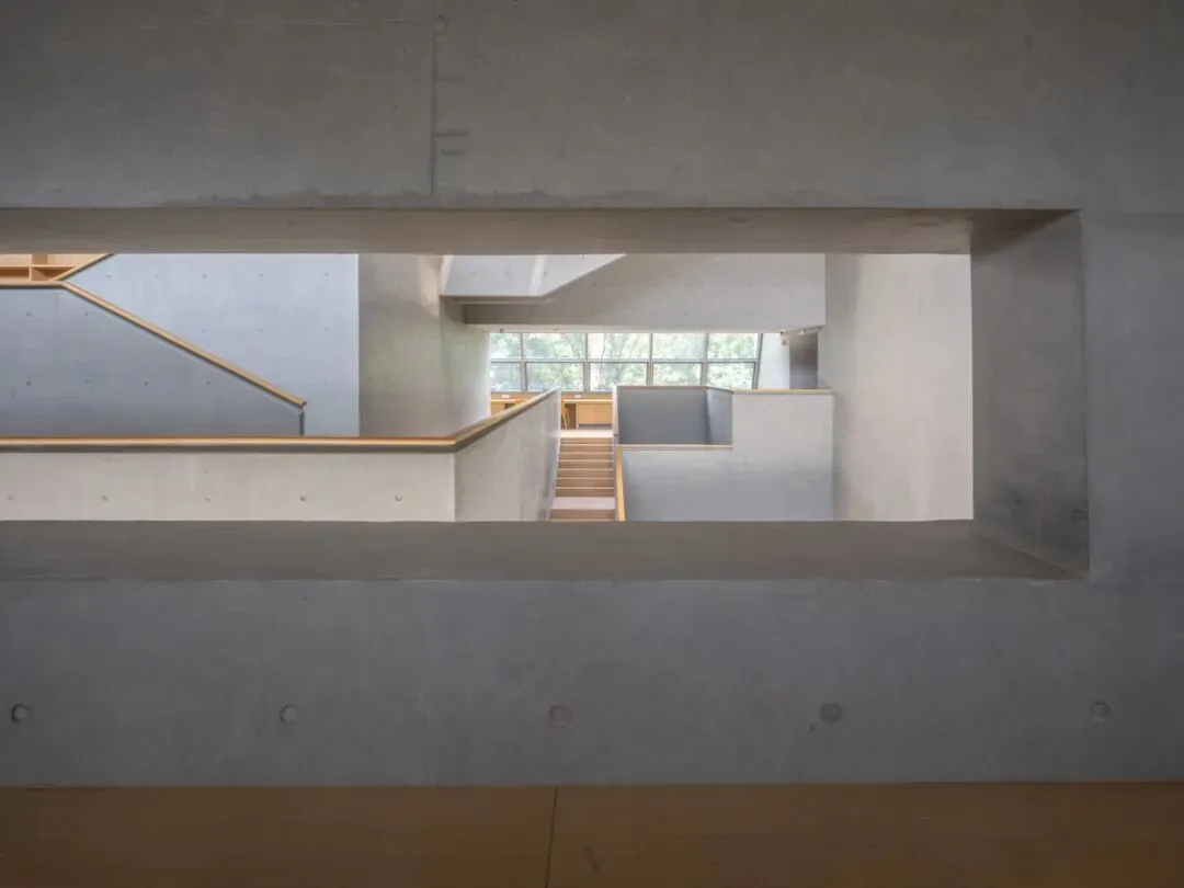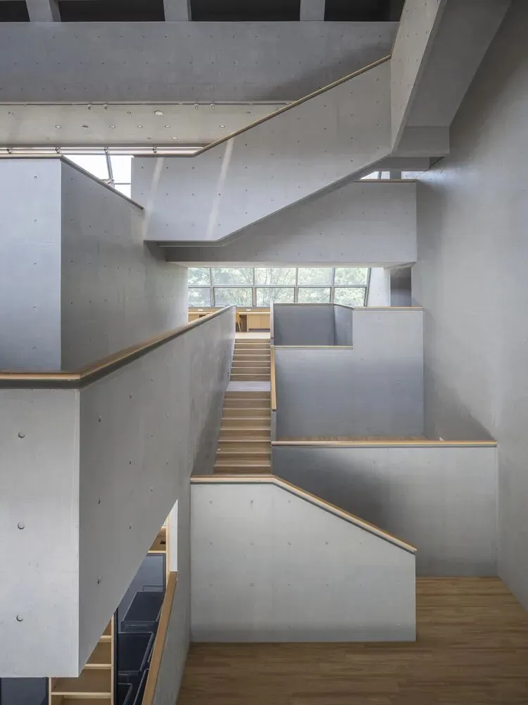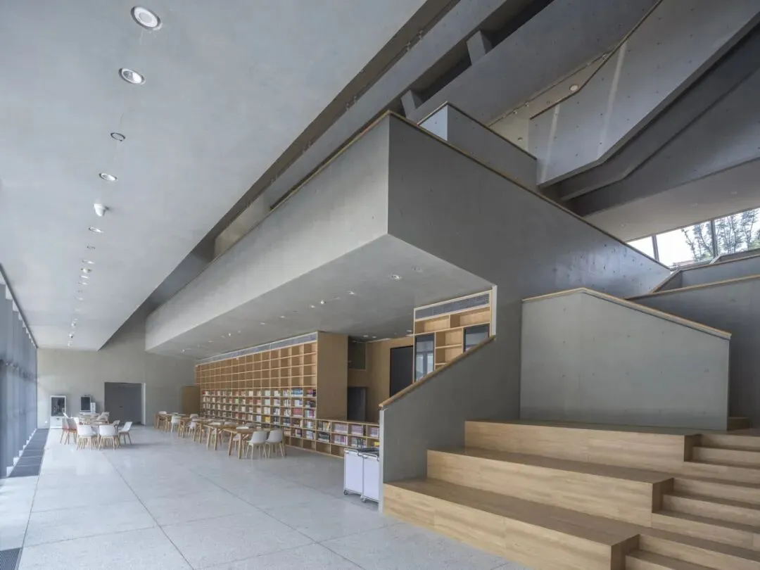 图书馆内外大量使用了光面竹胶板的清水混凝土,结构既是材料,也定义了空间。光滑的清水混凝土与实木地板、栏板及书架相结合,平衡了室内空间的雕塑感与亲切感。设备管道从中庭两侧的核心筒内接出,排布于大跨结构间的梁腔里。