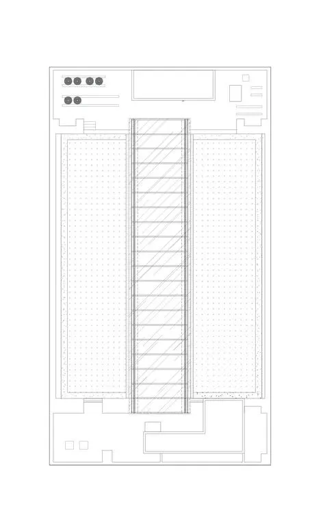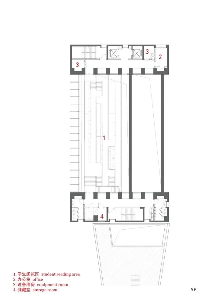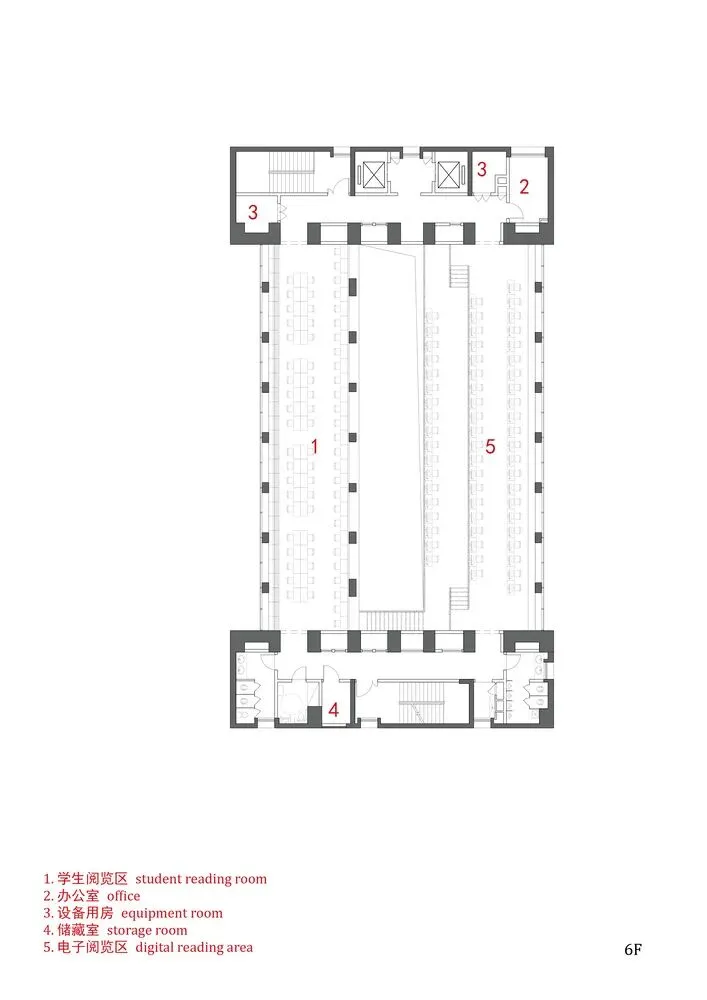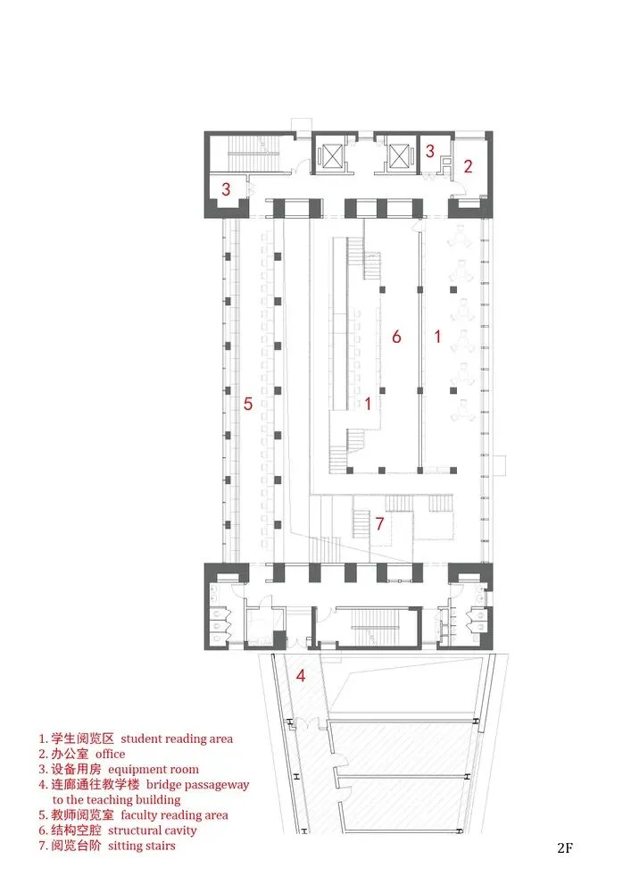 半封闭的管状阅览空间则主要容纳教师阅览室与藏书区,其标高与楼层相对应。阶梯及管状阅览空间采用大跨度斜向箱型与矩形截面梁结构,均架设于中庭两端的核心筒上。由此,中庭得以实现大面积的斜高窗,将室外大树的绿意映入室内。同时,管状阅览室利用通长条窗,建立与中庭的视觉联系。