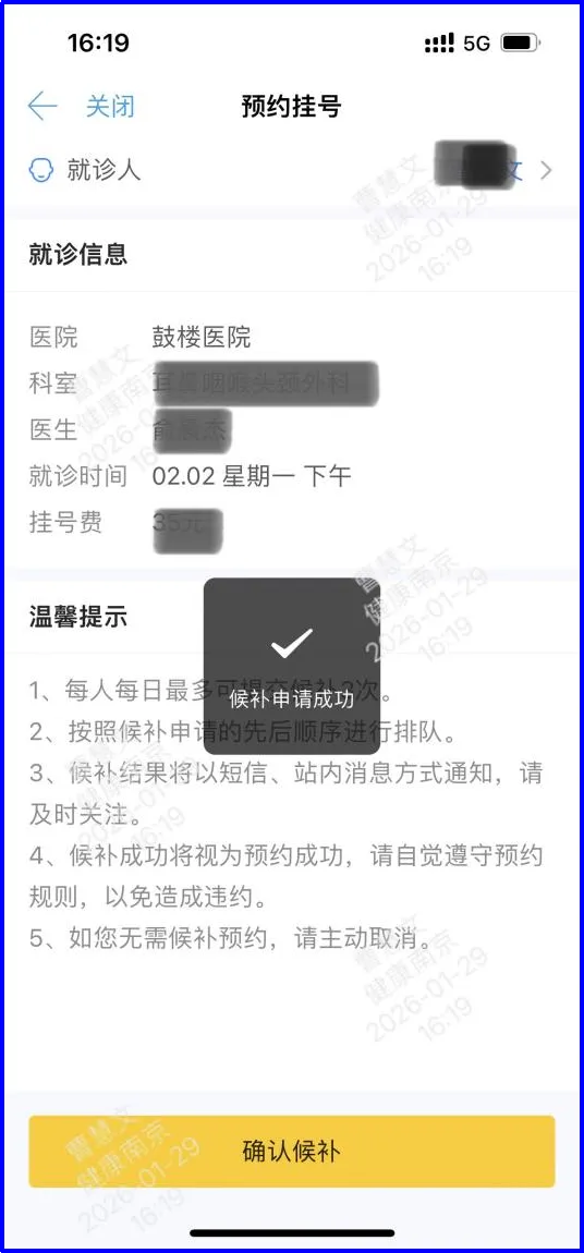 李女士想为父亲预约的是鼓楼医院心内科徐标主任的专家门诊,该专家号源常年紧张,放号即被抢空。“上周看到平台有候补预约选项后,我提交了申请,无须反复操作刷新,第三天就收到了候补成功的短信通知,今天顺利完成就诊。”李女士表示,该功能大幅提升了挂号便捷度。