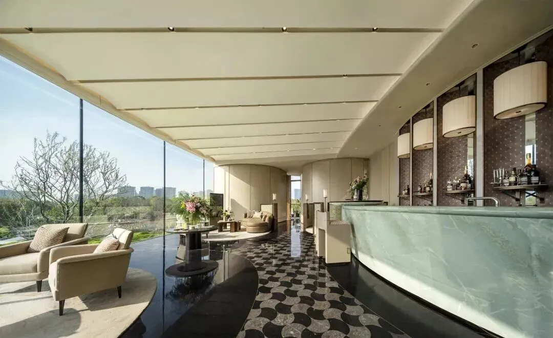 穿过大堂,约16米宽的曲面落地巨幕豁然开朗,将“烟笼寒水月笼沙”的诗意变为现实。270度无界视野,将国际友谊公园的如意湖、滨水绿廊与河西的天际线,悉数收藏为家中巨幅的动态壁画。
