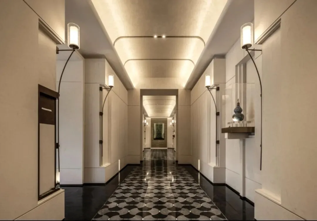 约10米挑高入户大堂,背景墙与地面均提取“凤翎”这一超级符号,宝铂灰、太古黑金与“只此青绿”三种珍稀石材,历经选形、打磨、水洗抛光,最终铺陈出如凤凰羽翼般流光溢彩的归家第一步。