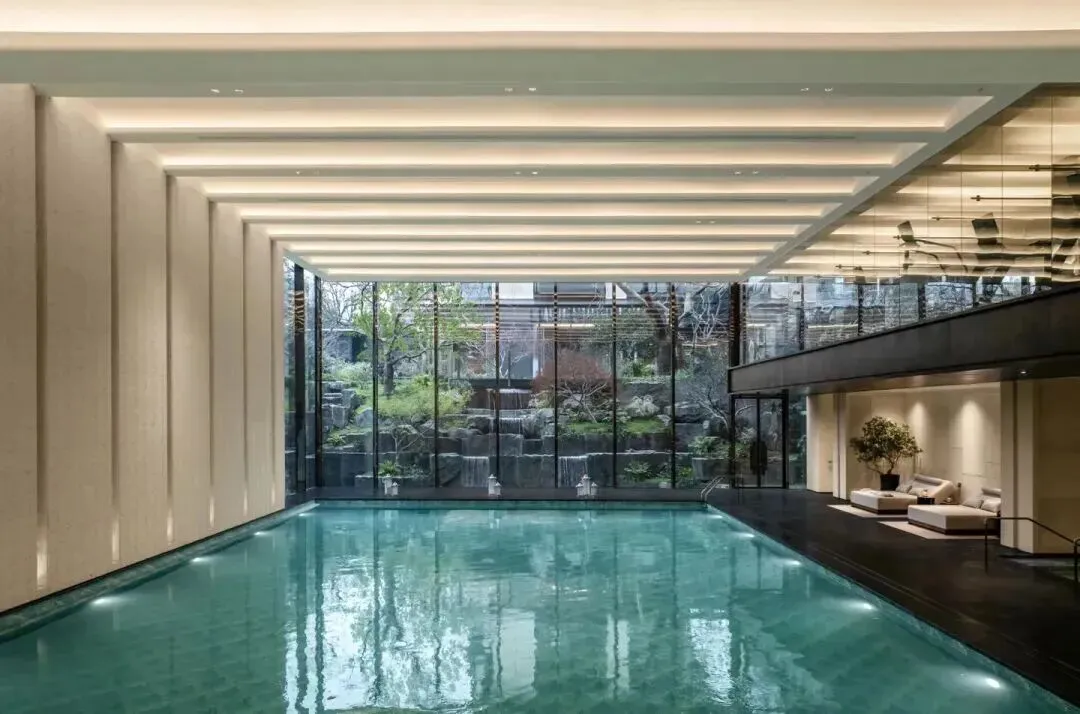 会所最令人惊艳的,是以“身心平衡”为理念打造的全维康体空间,其核心是河西唯一7.8米挑高的“月泠泉”恒温泳池,采用25米半标无边际设计,营造出震撼视野。游泳池墙面是莱姆石,连栏杆都镶嵌石材,低调中彰显质感。