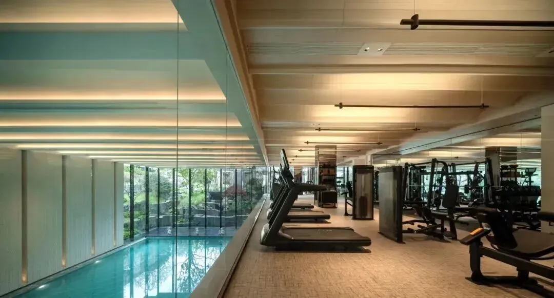 会所以“东西连廊,立体融合”的理念,与下沉庭院形成“景筑共生”的有机整体。全明的设计将阳光与空气大量引入,营造出开阔明亮的氛围,设置了恒温泳池、健身房、理疗室、书吧区、水吧区、私宴厅、棋牌室等多元空间。