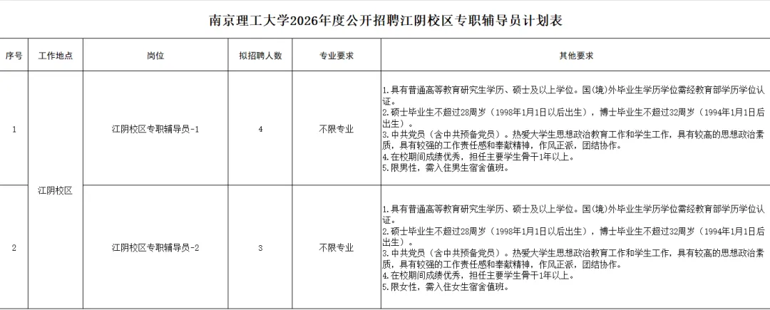 附件:《南京理工大学2026年度公开招聘江阴校区专职辅导员计划表》