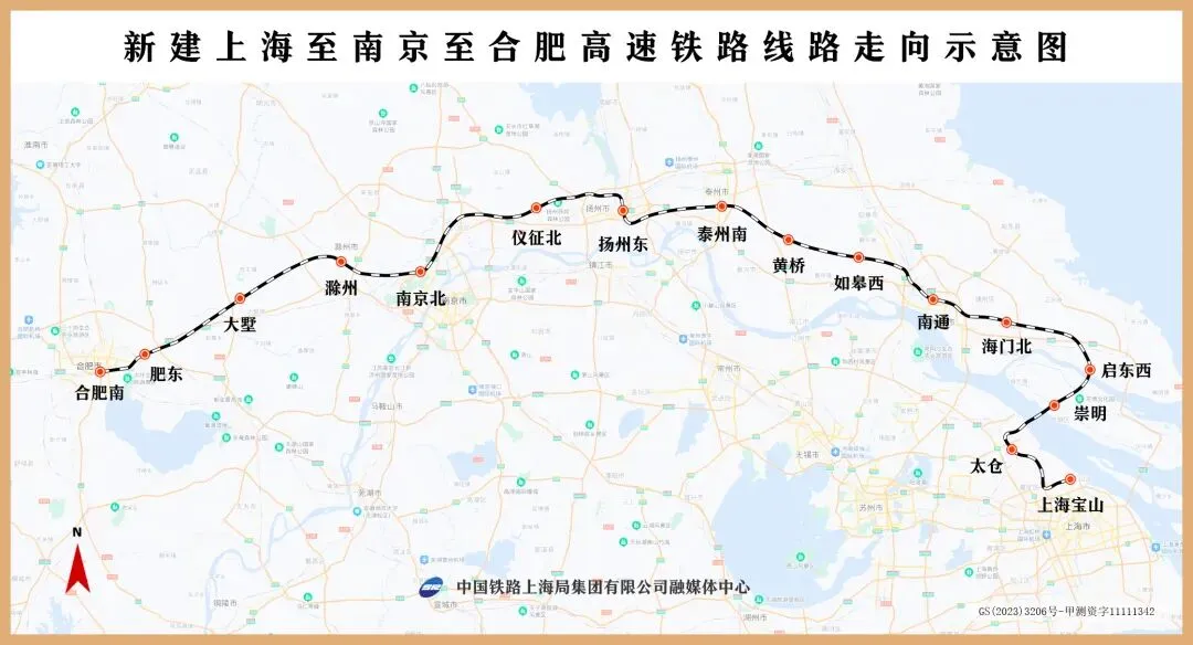 沪宁合高铁是沪渝蓉高铁的东段线路、国家“八纵八横”高速铁路网沿江通道的重要组成部分,起自上海市新建上海宝山站,经江苏省苏州市、南通市、泰州市、扬州市、南京市,以及安徽省滁州市、合肥市,接入既有合肥南站,线路全长约554公里(其中安徽段130.88公里),设计时速350公里,全线设16座车站(其中新建10座车站)。
