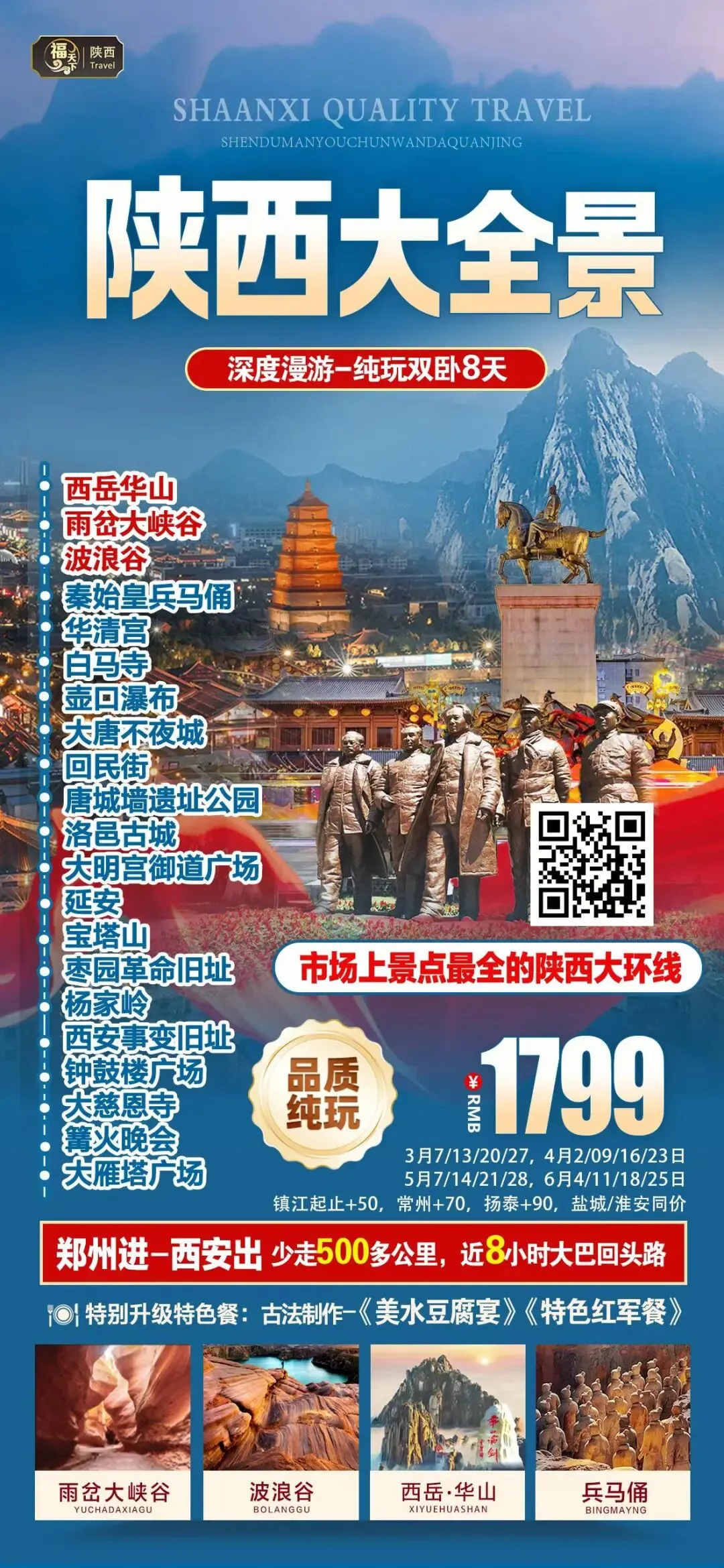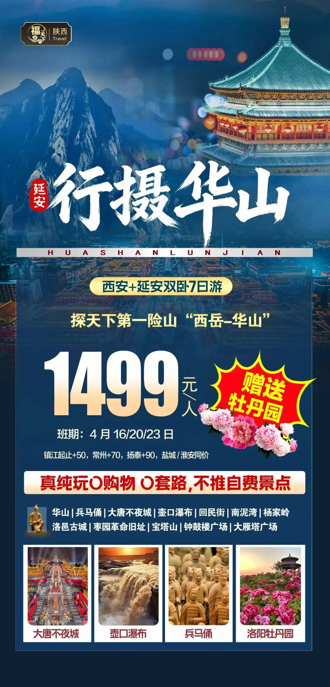 ✔ 西岳华山+延安+兵马俑+壶口瀑布+大唐不夜城+洛阳牡丹园