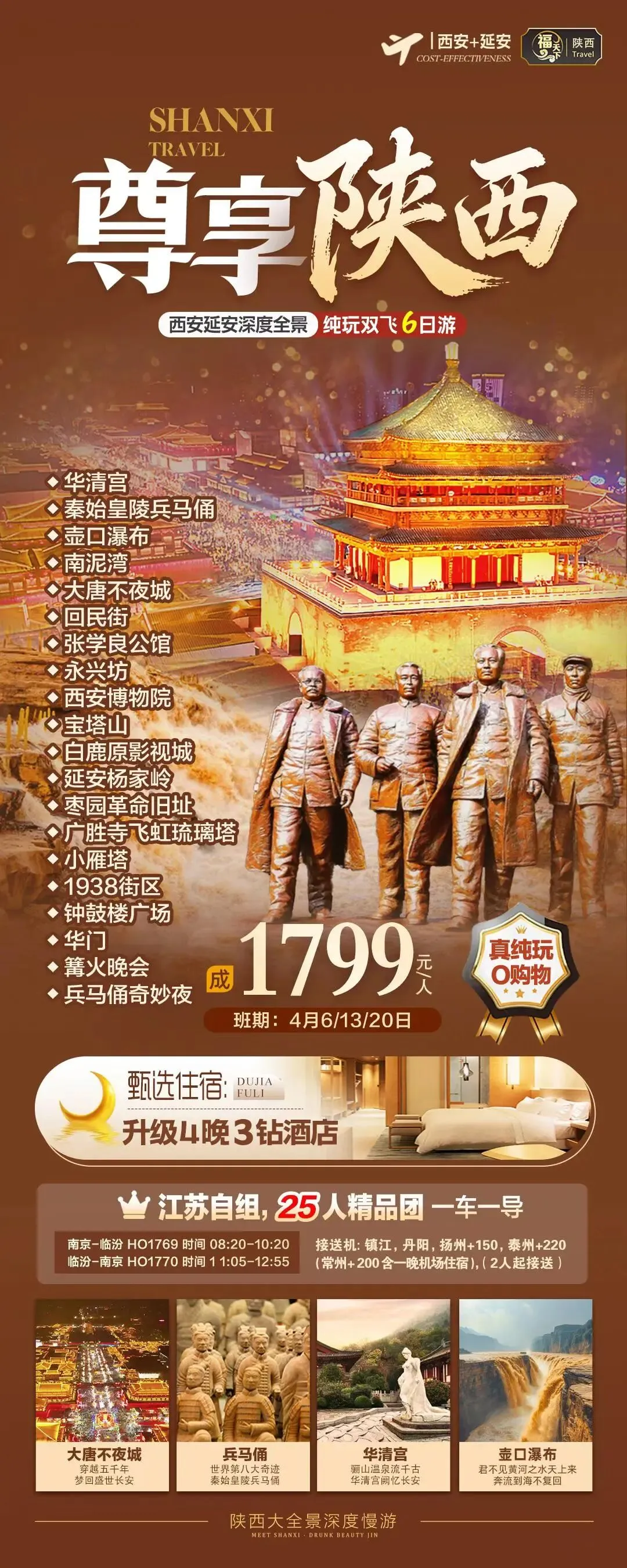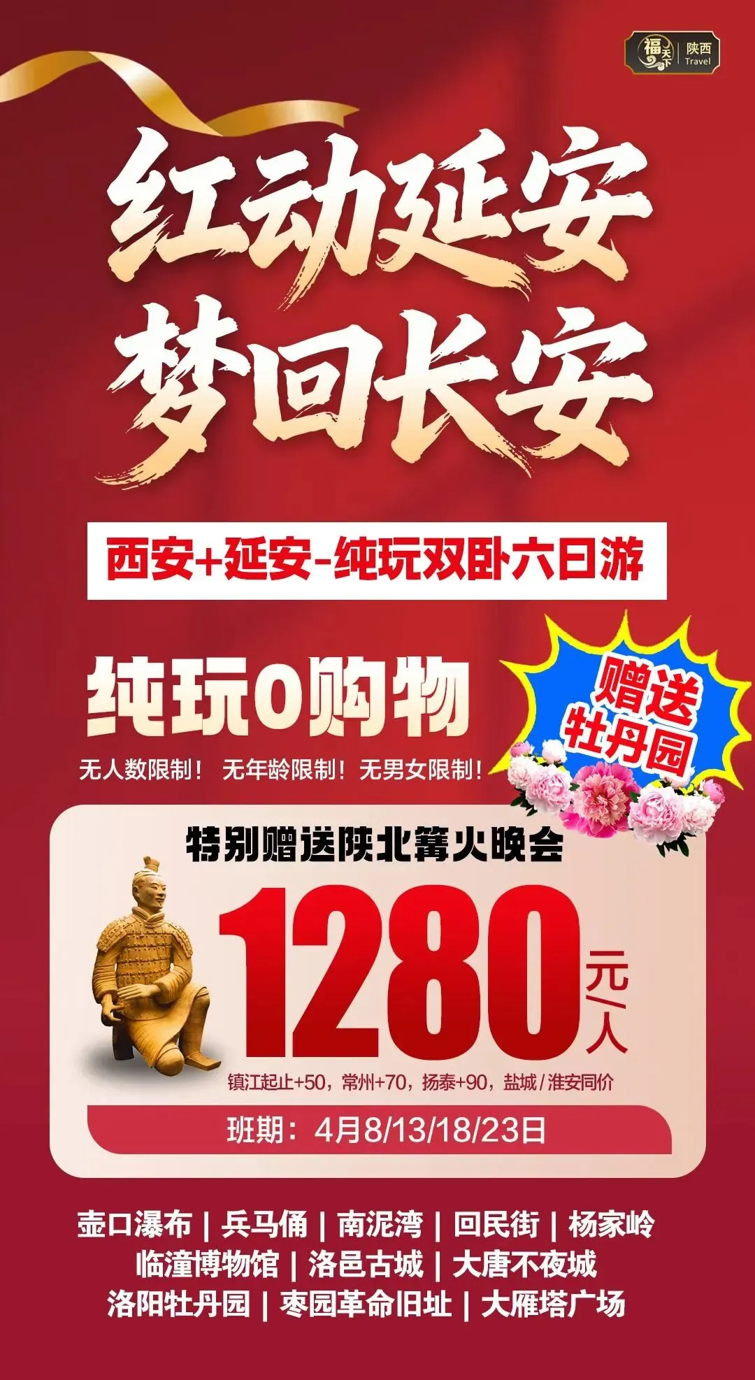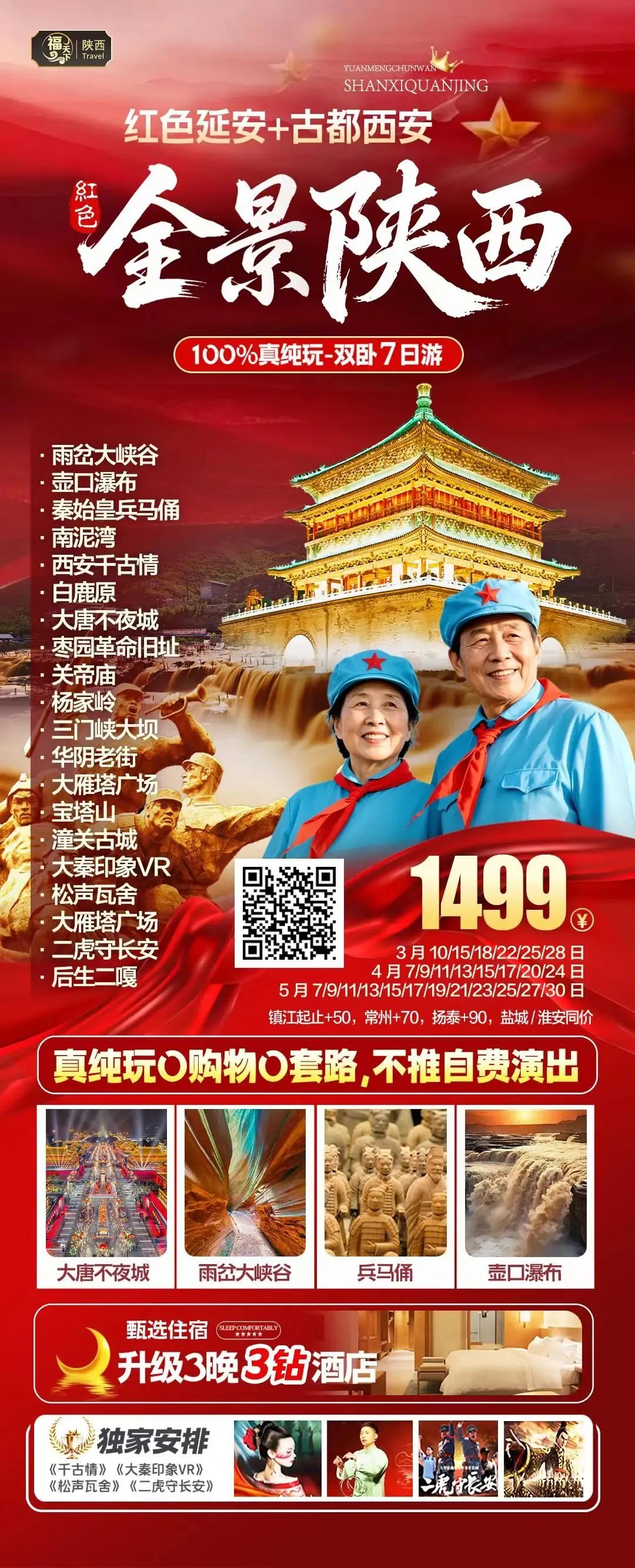✔ 西安+延安+兵马俑+壶口瀑布+南泥湾+大唐不夜城+钟鼓楼广场