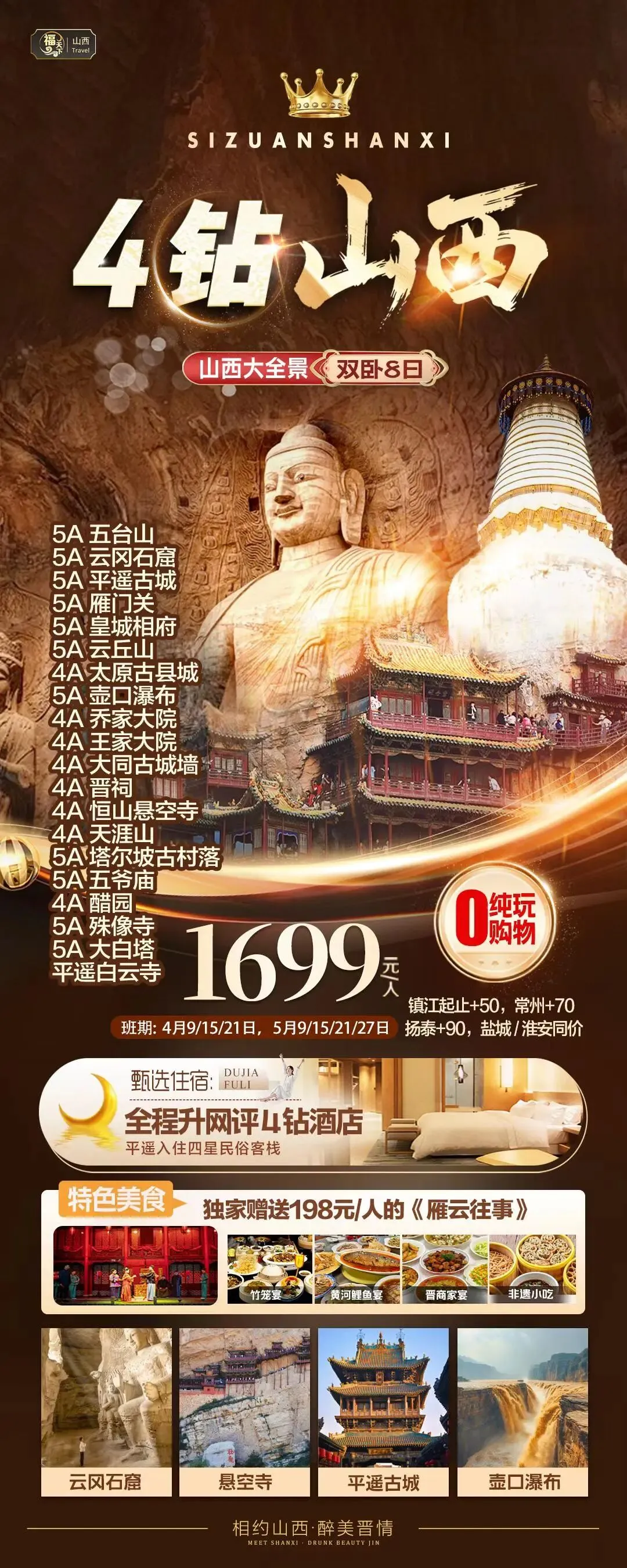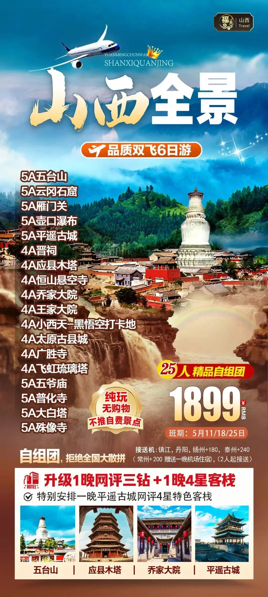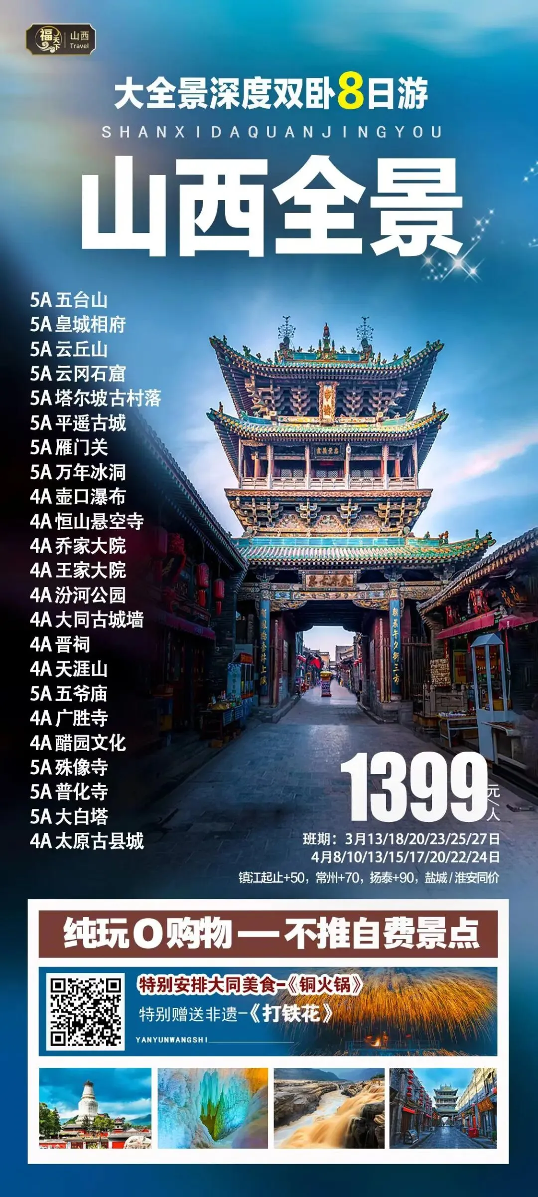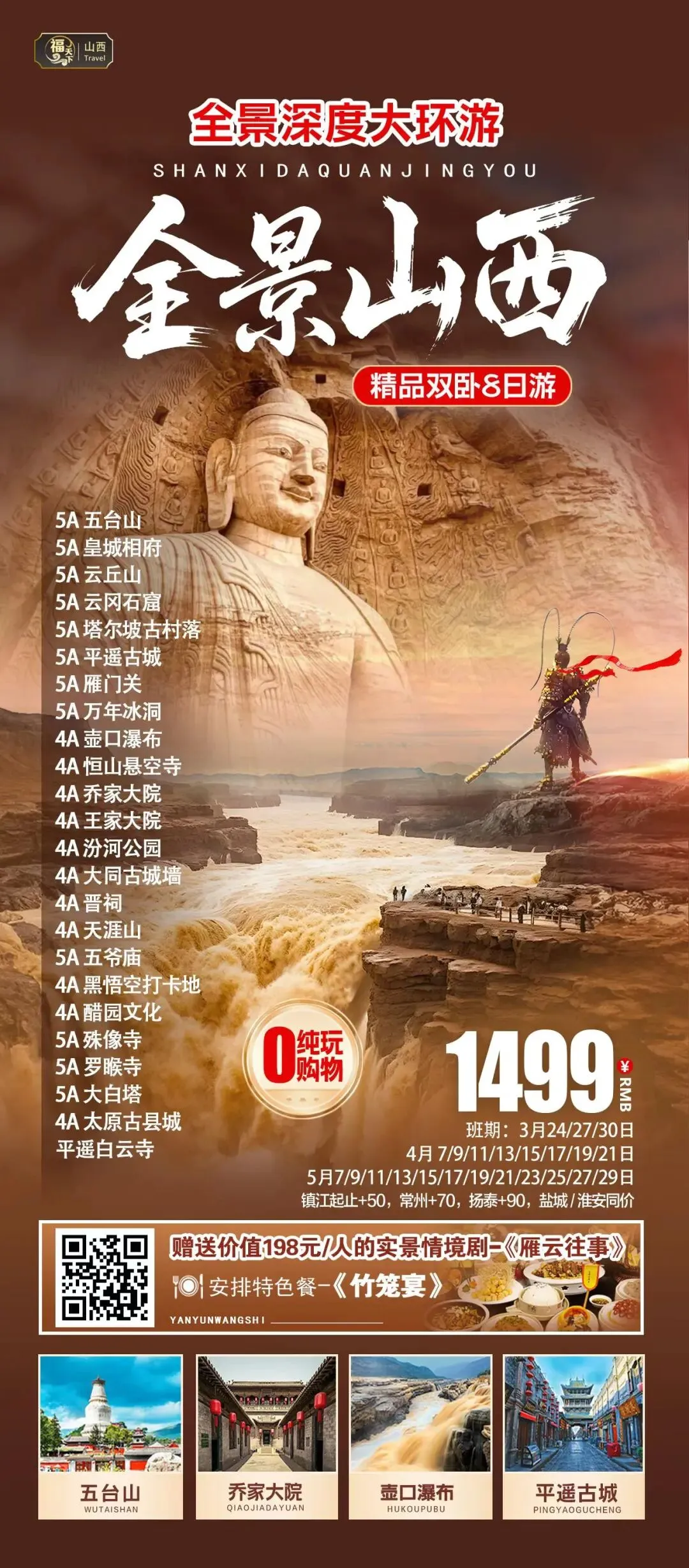 🔥 应县木塔+五台山+壶口瀑布+平遥古城+王家大院+乔家大院+云冈石窟+雁门关+晋祠等山西精华景点一次游遍,不留遗憾!