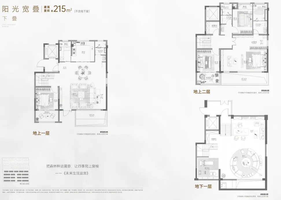 下叠(建面约 215㎡):地下一层、地上两层,一二层室内层高 3.3 米,地下层高 3.6 米。南向约 21 米连续采光面,采光效果显著。实际使用面积达到约 300㎡,空间利用率约 135%。