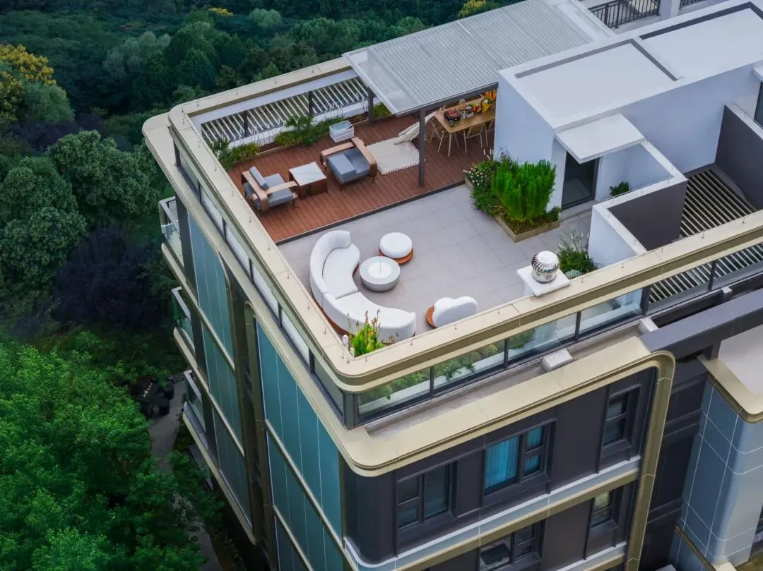 值得一提的是,这些户型通过合理设计,空间使用率表现接近 100%。约 5.9 米宽的挑空花园露台是最大亮点,北向还有设备平台赠送,进一步拓展了生活空间。
