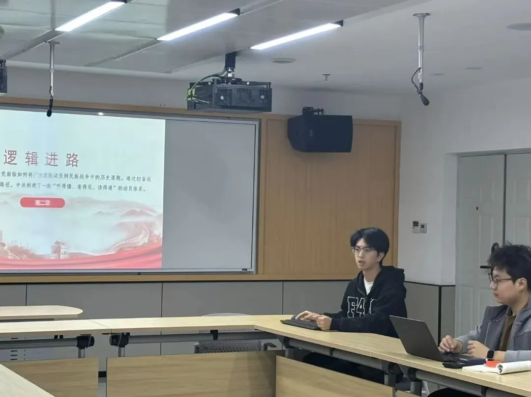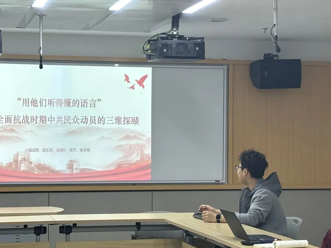第二组围绕“全面抗战时期中共民众动员的三维探赜”展开深入分析。吴易轩从经典作家相关论述出发,指出民众动员需同时实现思想动员与方法动员,并梳理了抗战前夕民众教育与早期宣传工作面临的现实困境。在此基础上,分析了扫盲运动推动下民众由“睁眼瞎”向“明白人”、从“强迫动员”到“自愿参与”的转变过程。吴志明则从文艺实践角度出发,介绍了戏剧改造、歌曲创作、秧歌革新、街头诗与朗诵剧等多样化形式,让群众能够“听得懂、看得见、读得通”,使党的抗战主张实现“可听、可见、可读”的传播效果。同时通过党报体系建设与书报发行,有效凝聚群众力量。小组最终总结出三点启示:组织化是凝聚民众力量的根本保障,大众化是文艺动员群众的有效路径,创新性是新时代传承发展的关键动力。