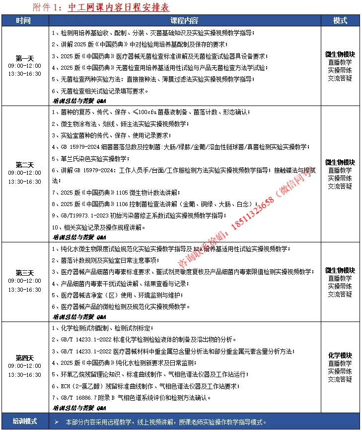 本课程以深度实操为导向,系统整合行业最新法规与权威标准,结合真实检验场景设计教学内容,致力于在规范指导下切实提升学员的实验动手能力与操作合规水平。1、法规标准全涵盖,紧扣监管动态课程内容严格对标最新监管要求,系统纳入:l 体系规范类:《医疗器械生产质量管理规范无菌医疗器械现场检查指导原则》;l 检查指南类:《医疗器械无菌检验检查要点指南(2023版)》;l 药典通则类:2025年版《中国药典》无菌检查、微生物限度、细菌内毒素等相关通则;l 国家标准类:GB 15979-2024、GB/T 19973.1-2023、GB/T 14233.3-2024等关键标准。2、教学突出实操性,强化动手能力培训以实验室实操为主线,通过分步演示、跟学训练、实时纠偏与重复强化,重点提升学员的动手操作熟练度、流程规范性与结果可靠性,实现“学即能用、做即合规”。3、紧贴企业实际场景,注重学用结合围绕企业日常检验任务与常见问题设计实验项目,帮助学员在模拟真实工作场景中掌握标准执行要点与异常情况处理方法,有效衔接培训内容与实际工作。4、学以致用,赋能岗位胜任通过系统训练与考核反馈,确保学员返回工作岗位后能够独立、规范地完成日常微生物检验任务,具备持续符合法规要求的能力,从而真正胜任检验岗位职责,为企业质量控制体系提供稳定可靠的人员保障。