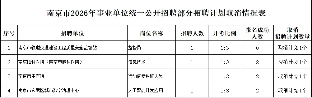 现根据公告要求,对部分未达开考比例的岗位取消招聘计划,共取消招聘计划4个,涉及4家事业单位,具体情况详见附件。请报考被取消岗位且已缴费确认的考生于2026年3月30日9∶00-12∶00登录南京人事考试网补报其他符合条件的岗位。