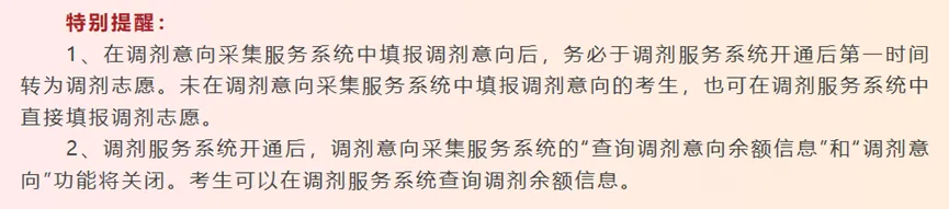 2.转为调剂志愿:调剂服务系统将于4月8日00:00开通,请调剂考生第一时间将调剂意向转为调剂服务系统中的调剂志愿。已转成功的调剂志愿与直接在调剂服务系统填报的调剂志愿一样,在招生单位设置的锁定时间内不可取消或更改;未转成功的调剂意向在调剂服务系统中无效。