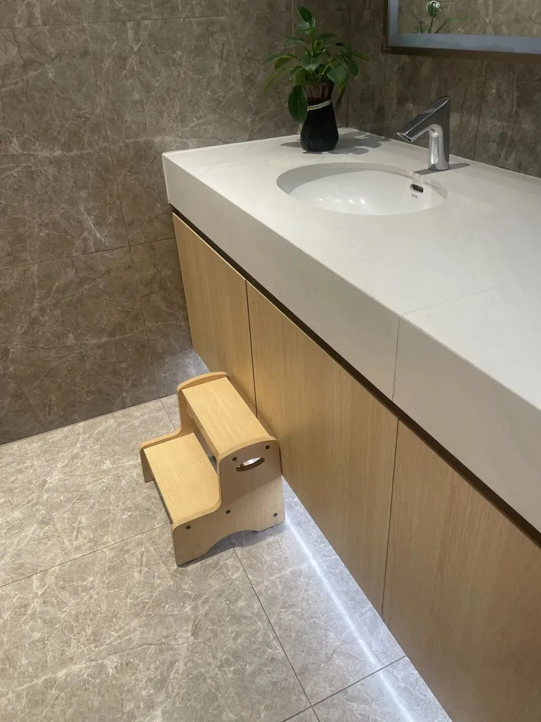 在男卫生间的洗手池前,摆放着一个小阶梯,方便儿童自行清洗;