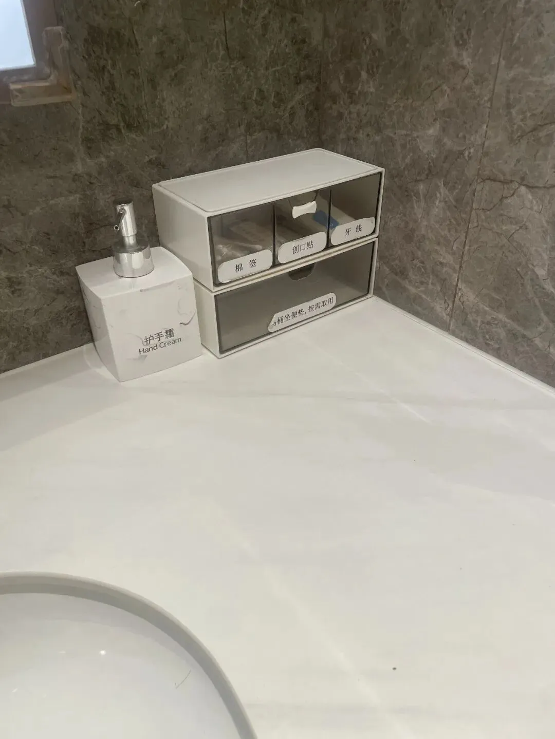 洗手池角落还放置了护手霜、棉签、创口贴等用品。