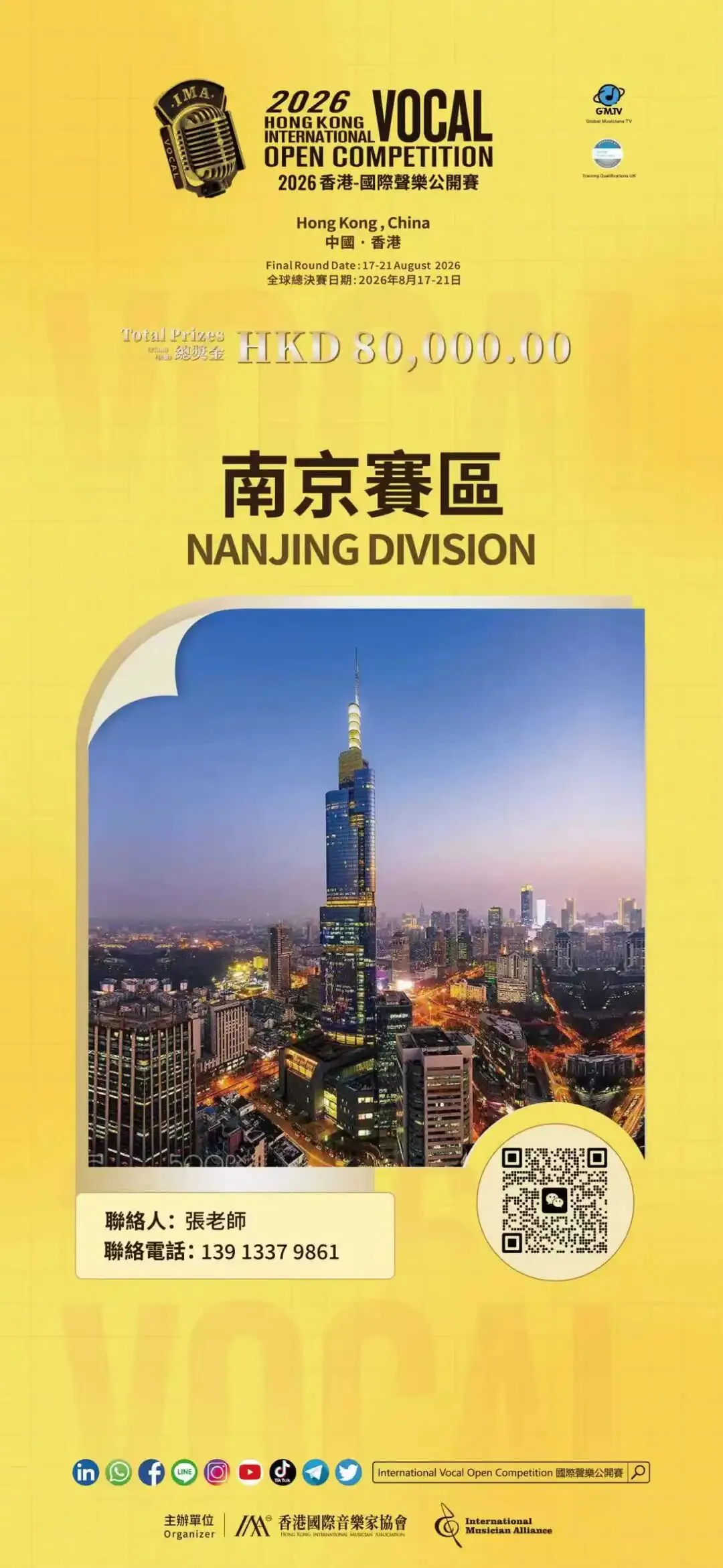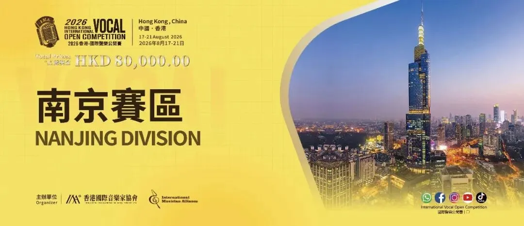 2026香港-國際聲樂公開賽-南京赛区已正式啟動報名!本次選拔賽設置線上比賽方式,組別及曲目要求一致、評分標準一致,比賽結果具有同等效力,獲得選拔賽二等獎及以上的參賽者均獲得總決賽的參賽資格。