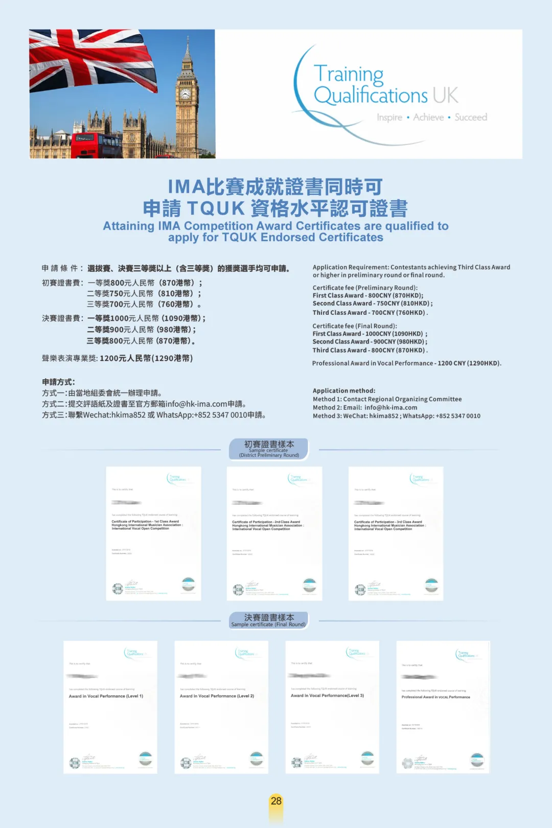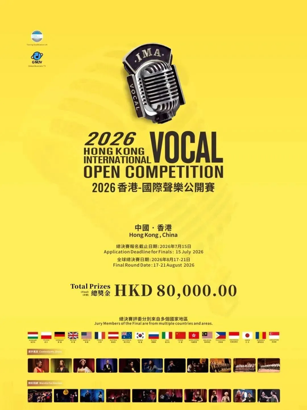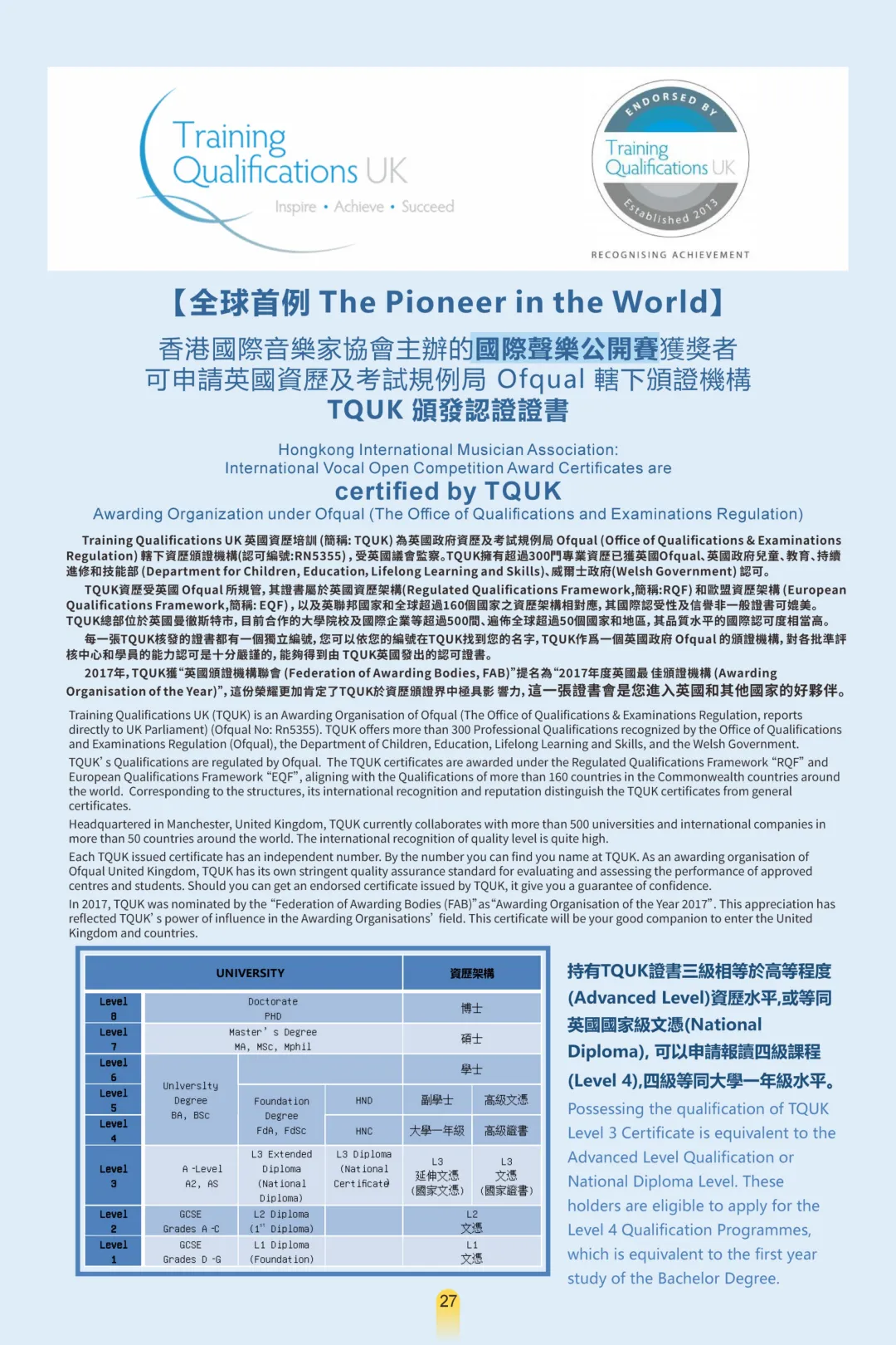 1. 是全球首個獲英國TQUK(Training Qualifications UK) 認證的聲樂賽事,TQUK 受英國 Ofqual 監管,與雅思、A-Level 同屬英國官方認可體系。