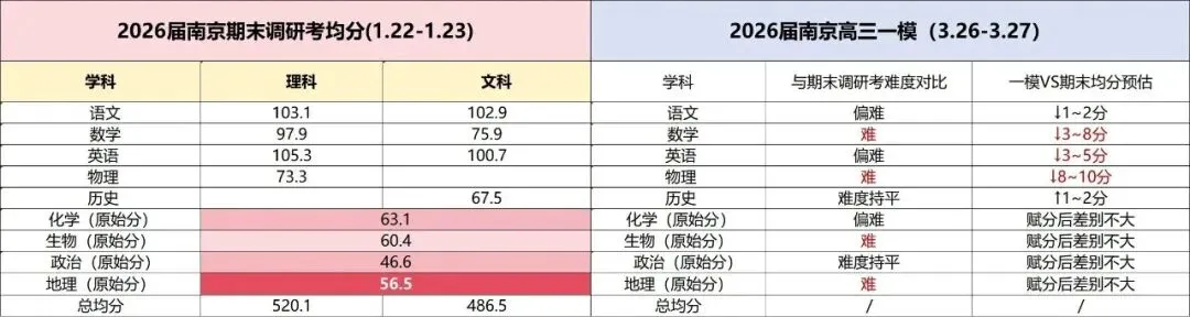 有网友把这次南京一模考试和1月份的南京期末调研考难度做了对比,这次整体的难度比零模的时候要难,一模各学科均分估计要下降。
