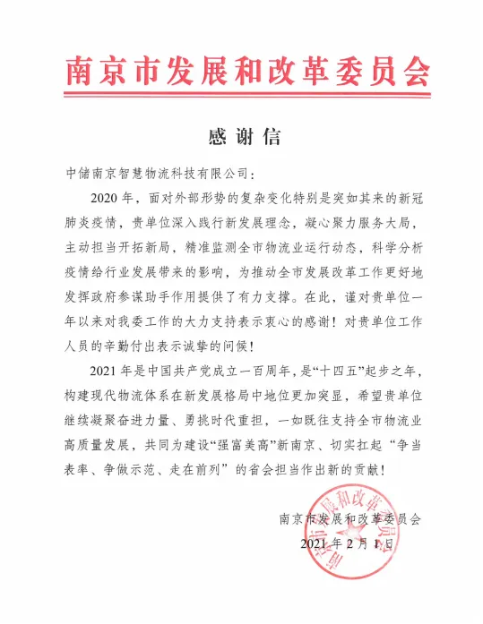 2月1日,南京市发展和改革委员会向中储智运发来感谢信。