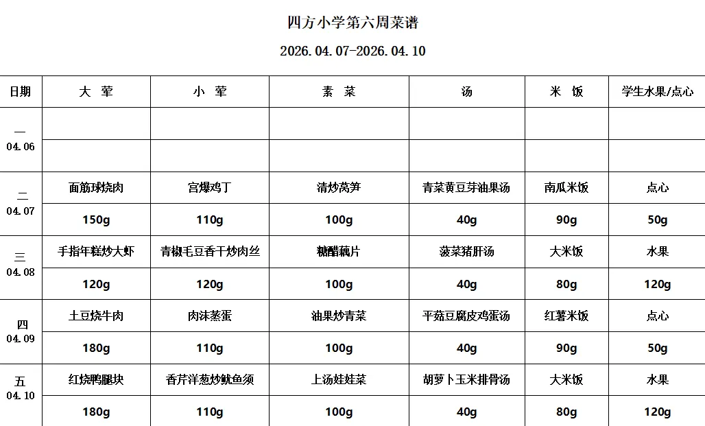 >南京市四方小学2025-2026年度第二学期第6周菜谱