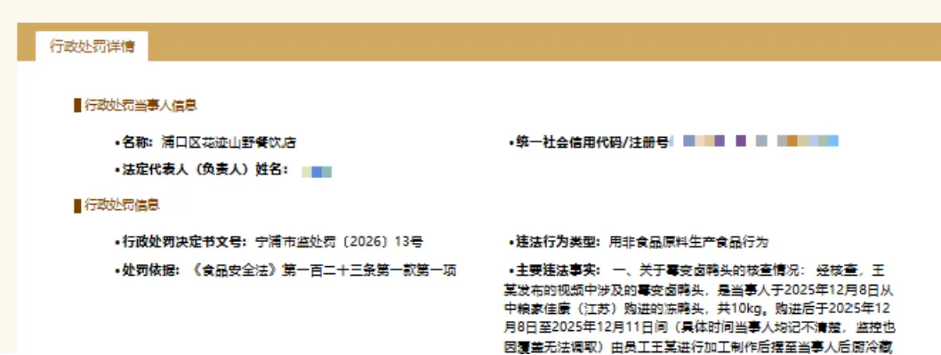 3月26日,记者从国家企业信用信息公示系统网站(江苏)了解到,南京市浦口区花迹山野餐饮店因涉嫌使用非食品原料生产食品行为被浦口区市场监管局处罚。据悉,2026年1月,有网友发布视频称,南京市浦口区花迹山野餐饮店存在发霉食材翻新、店员脚踩食材等问题,视频发布者自称为该餐厅前员工,并表示对内容真实性负责。经浦口区市场监管局调查,该店员工王某在网络平台发布的视频中所涉及的霉变卤鸭头,系当事人于2025年12月8日购进的冻鸭头,经加工制作后存放于冷藏柜。执法人员调取监控视频发现,王某于12月17日对上述卤鸭头进行再次加工,共制作两盘,其后分别于12月18日和12月20日被倾倒销毁。当事人在此期间未销售卤鸭头,且对霉变变质情况不予认可,仅承认摆放时间较长。