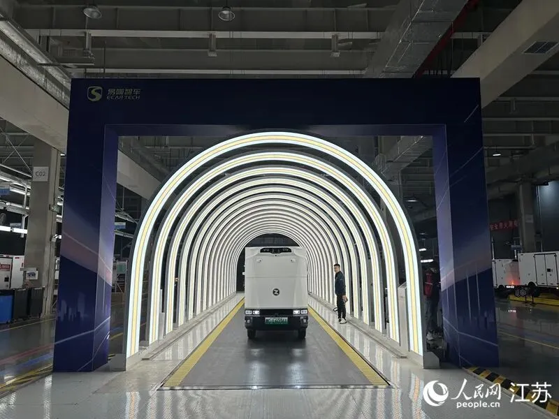 南京易咖智车科技有限公司智能工厂内,智能无人车正在接受检测。人民网记者 王丹丹摄