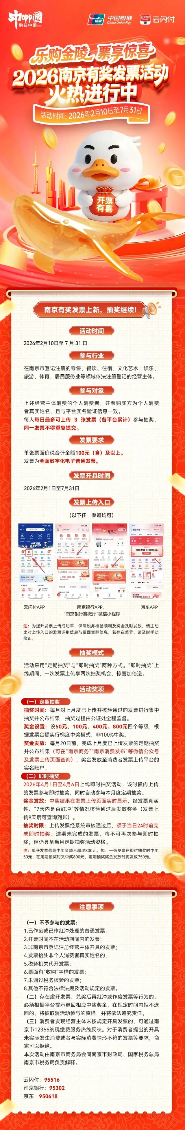 个人消费者在全市零售、餐饮、住宿、文化艺术、娱乐、旅游、体育、居民服务业等八大民生领域消费,并取得单张票面金额100元(含)以上的全面数字化电子普通发票,开具时间为2026年2月1日至7月31日,即可参与抽奖,单张发票奖金10—800元不等。可通过云闪付App、南京银行App、南京银行鑫微厅、京东App等平台入口参加。详情