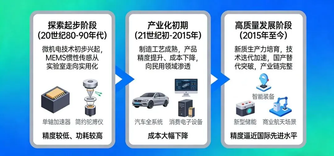 MEMS惯性传感的发展与微机电技术、工业自动化、航空航天等产业的升级同频共振,历经三个关键阶段,逐步实现从技术突破到规模化应用的跨越式发展,每一步迭代都推动其核心性能与应用边界持续拓展:
