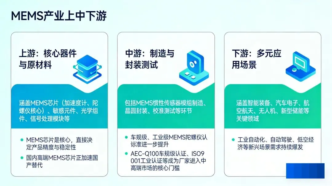 上游:核心器件与原材料:作为产业发展的根基,涵盖MEMS芯片(加速度计、陀螺仪核心)、敏感元件、光学组件、信号处理模块等,其中MEMS芯片是核心,直接决定产品精度与稳定性,目前国内高端MEMS芯片正加速国产替代,成为产业突破的关键。