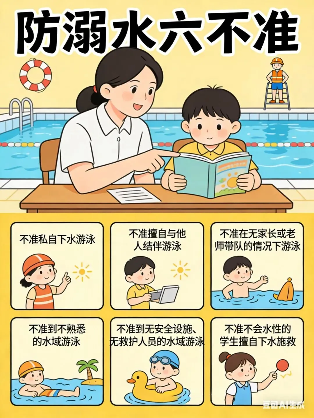 假期气温回升,溺水风险加剧,请加强孩子防溺水教育,牢记“六不准”;孩子外出时,您需严格做到“四知道”(知去向、知同伴、知活动内容、知归时),教育孩子相互监督,发现危险及时报告家长或老师。