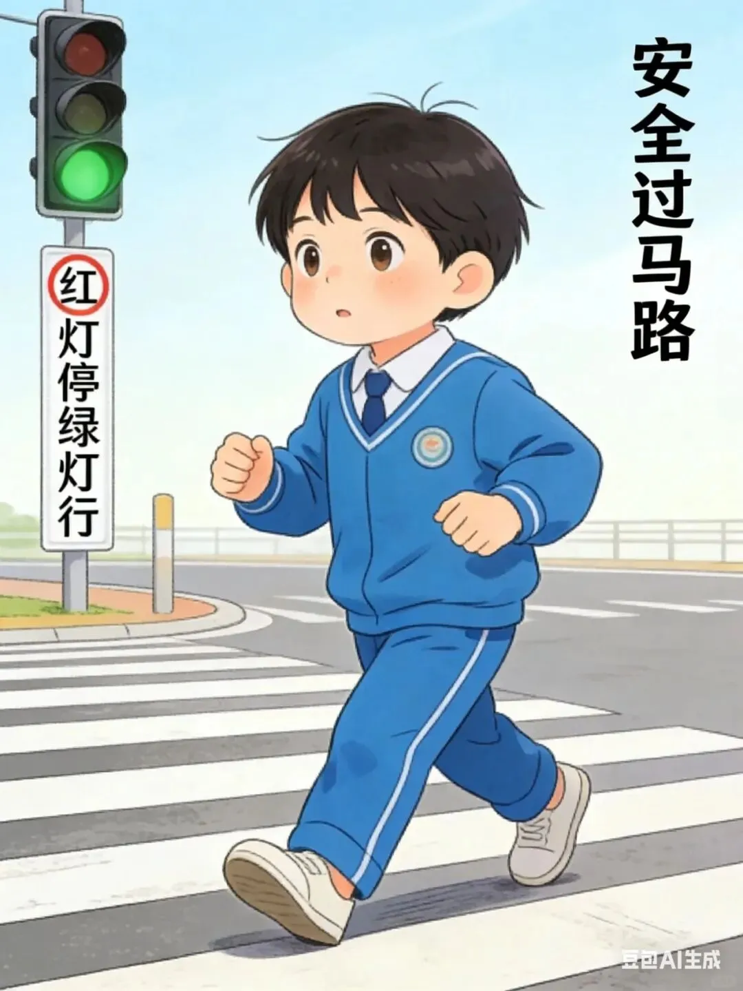 教育孩子遵守交通法规,过马路、走人行横道、按信号灯通行,不闯红灯、不打闹、不分心。
