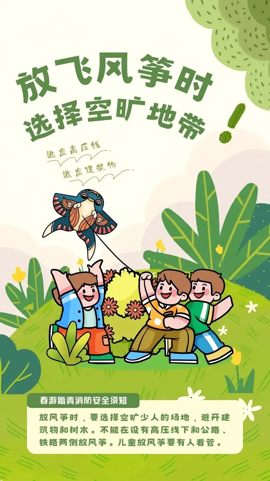 外出踏青选择正规安全的场所,避开无安全保障的区域;根据天气准备合适衣物和用品,确保孩子始终在您的视线范围内。放风筝选择空旷无障碍物的场地,远离高压线等危险区域,需成人全程看护。