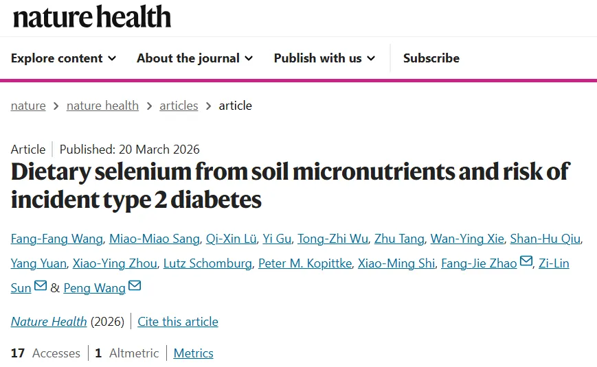 参考文献:Wang, FF., Sang, MM., Lü, QX. et al. Dietary selenium from soil micronutrients and risk of incident type 2 diabetes. Nat. Health (2026). https://doi.org/10.1038/s44360-026-00075-4