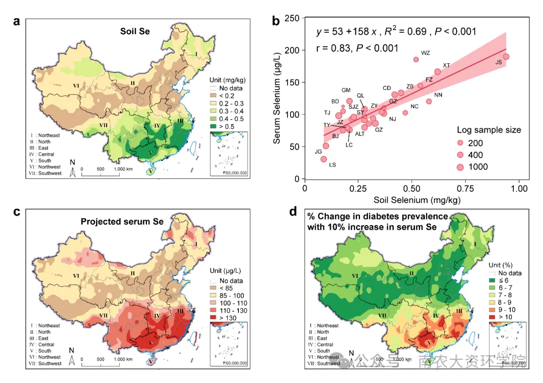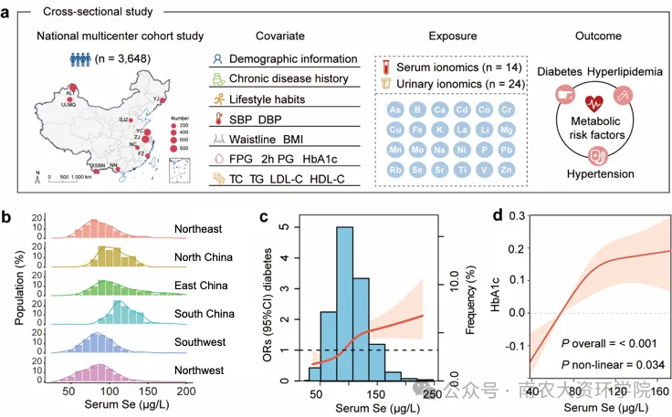 近日,南京农业大学汪鹏教授团队联合东南大学附属中大医院、中国疾控中心等单位,在Nature Health在线发表题为“Dietary selenium from soil micronutrients and risk of incident type 2 diabetes”的研究论文。该研究揭示了我国人群硒营养的地域分异格局,发现血清硒水平偏高会增加糖尿病和高脂血症风险,并证实土壤硒与人群血清硒高度相关,表明土壤是影响居民硒营养状况的关键因素。该研究结果为我国科学补硒、富硒产业规范和慢病防控发展提供了重要科学依据。