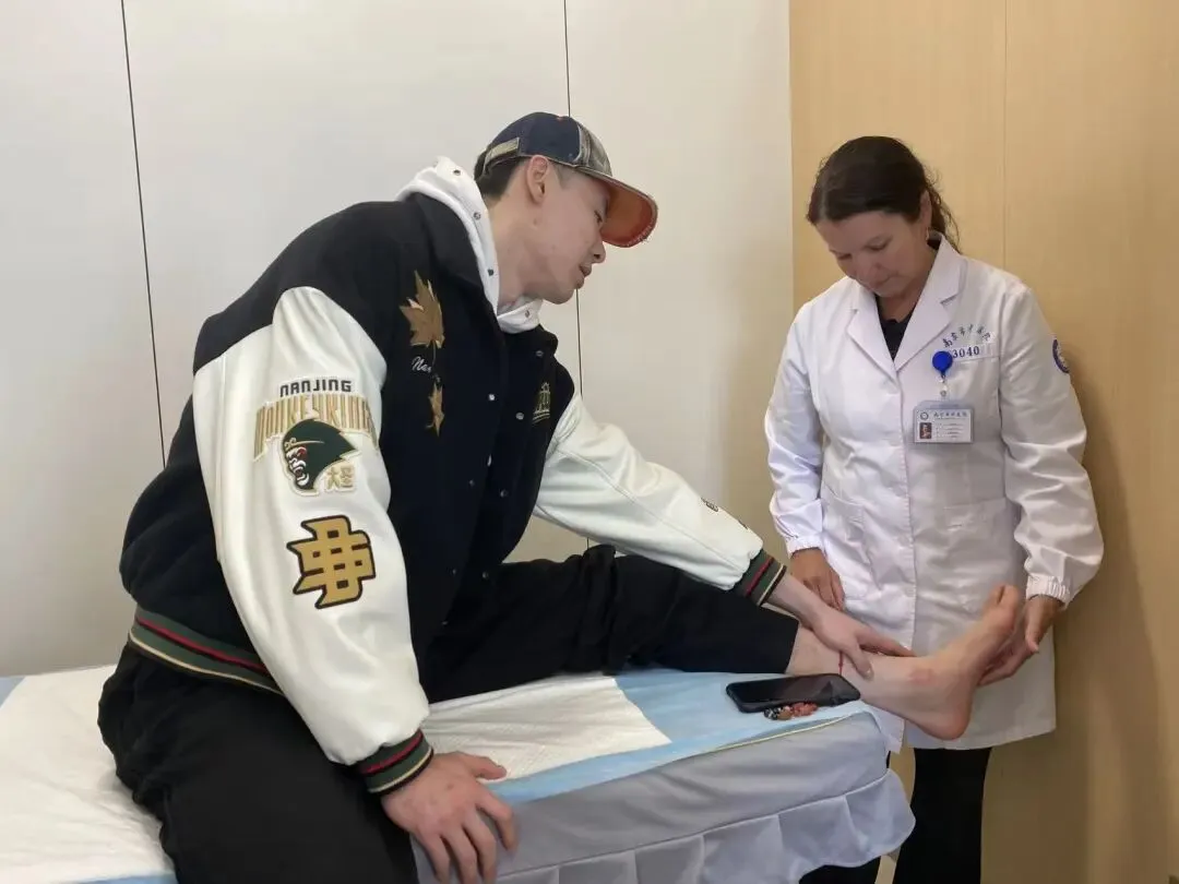 门诊开诊以来,Tania Pizzari教授每天准时来到诊室,全程专注投入,接诊多位饱受运动损伤困扰的患者。这天,南京天之蓝篮球俱乐部队员郭昊文慕名而来。原来,他前几天参加比赛不慎崴了脚,有些红肿,简单处理过后,得悉Tania Pizzari教授莅临南京市中医院的消息,感觉机会难得,于是打算当面咨询问诊。他向Tania Pizzari教授表达了自己的担忧:因为以前有过一次很严重的骨折,这次受伤会不会很严重?Tania Pizzari教授对其进行了仔细的检查,确认骨头以及肌腱韧带没有非常严重的损伤,而是脚踝韧带的拉伤。教授根据伤情进行了手法治疗的处理,并指点团队工作人员引领其至运动医学科接受高能量激光治疗和电疗。最后,还仔细交代了一些回去需要进行的锻炼,逐步恢复。教授的治疗与安慰让郭昊文安心不少,重返赛场竞技,指日可待!