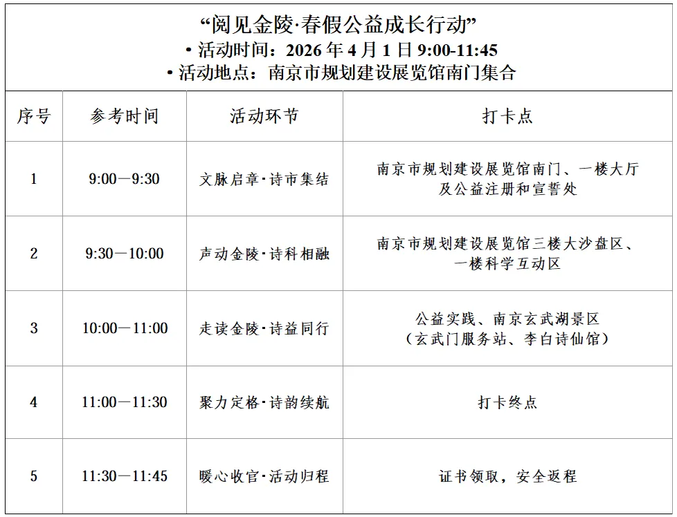 今年,南京的孩子们有了新选择——南京市青少年宫联合南京市规划建设展览馆、南京市玄武湖公园管理处、江苏省科学传播中心、江苏凤凰少年儿童出版社、南京市青年志愿者协会、南京市圆梦青少年发展基金会、江苏省期刊协会科普期刊专业委员会共同推出 “阅见金陵·春假公益成长行动”,用“三个一”公益计划(注册公益身份、参加公益培训、完成公益实践),让孩子在诗词与科学中收获成长,用行动温暖城市!