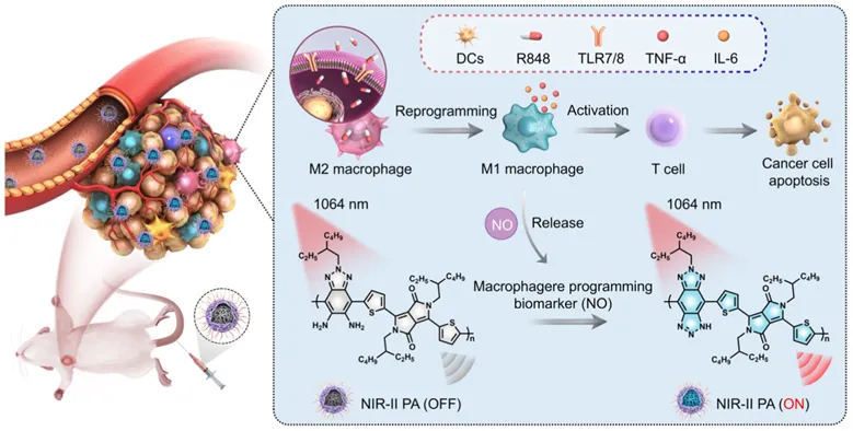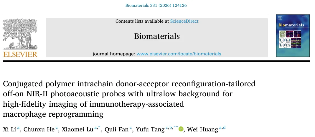 《Biomaterials》(IF=12.9)近日,南京工业大学卢晓梅教授、新加坡国立大学唐玉富教授团队联合西北工业大学黄维院士团队在其上发表了题为“Conjugated polymer intrachain donor-acceptor reconfiguration-tailored off-on NIR-II photoacoustic probes with ultralow background for high-fidelity imaging of immunotherapy-associated macrophage reprogramming”的研究成果。该研究创新性地提出“共轭聚合物链内给体-受体重构”策略,通过设计一氧化氮(NO)响应的半导体聚合物 BDP 并自组装为 BDPNP 纳米探针,实现了超低背景的“关-开” NIR-II 光声成像,用于免疫治疗中 M2-to-M1 巨噬细胞重编程的高保真监测。本研究首次通过链内给体-受体重构设计,解决了传统“关-开”探针背景干扰的难题,结合 NIR-II 光声成像的高灵敏度和深组织穿透性,为癌症免疫治疗反应的实时、无创评估提供了强大工具,展现出重要的临床转化前景。