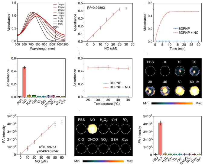 本研究评估了 BDPNP 纳米探针在体外对 NO 的光学响应性能。实验结果表明,随着 NO 浓度的增加,BDPNP 在 1064 nm 处的吸收强度呈浓度依赖性增强;反应动力学测试显示 BDPNP 在 10 分钟内即可快速响应 NO。特异性实验表明,仅 NO 能显著增强 BDPNP 在 1064 nm 处的吸收,且该响应在生理温度范围(25-45°C)内保持稳定。进一步的光声成像验证显示,BDPNP 在 1064 nm 激光激发下,其光声信号随 NO 浓度升高而增强,且未加 NO 时信号与纯 PBS 无显著差异,同时仅 NO 处理组产生强烈光声信号,其他干扰物质组无明显变化。该实验证实了 BDPNP 具有超低背景、高灵敏度、高选择性以及快速响应的 NIR-II 光声成像性能,为后续细胞和活体水平的巨噬细胞重编程成像奠定了坚实基础。