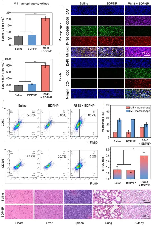 通过 ELISA、免疫荧光染色、流式细胞术和组织学分析,系统验证了体内光声成像结果与巨噬细胞重编程及免疫激活的相关性。可以看到 R848 + BDPNP 组小鼠血清中 IL-6 和 TNF-α 水平显著高于生理盐水和仅 BDPNP 组;免疫荧光显示该组中 F4/80 + CD80 +共染的 M1 巨噬细胞明显增多,而 F4/80 + CD206 +共染的 M2 巨噬细胞减少,同时 CD4+ 和 CD8+ T 细胞浸润显著增强;流式定量分析进一步证实,R848 + BDPNP 组 M2 巨噬细胞比例从 25.9% 降至 16.2%,M1 比例从 5.9% 升至 13.2%,M1/M2 比值从 0.32 升至 0.80,而 M5049 预处理组则逆转了这些变化;H&E 染色显示各组主要器官均无明显病理损伤。这些结果直接证明了 R848 成功诱导了 M2-to-M1 巨噬细胞重编程及适应性免疫激活,且与 BDPNP 增强的 NIR-II 光声信号高度一致,同时验证了 BDPNP 良好的生物安全性。本研究通过开发首例超低背景的“关-开”型 NIR-II 光声探针,成功解决了传统探针因肿瘤蓄积产生高背景信号而难以区分生物标志物触发信号的难题,为癌症免疫治疗中巨噬细胞重编程的高保真、实时、无创成像提供了创新工具。