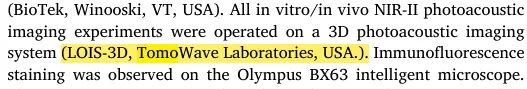文章中光声成像部分的实验数据用的是 TomoWave 自主研发的 LOIS-3D 小动物全身 3D 光声成像系统。