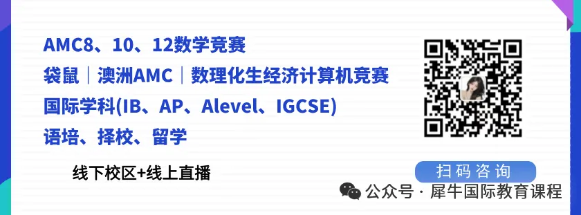犀牛教育在AMC8的课程方面,根据孩子的基础设置了preAMC8全程班、AMC8全程班、AMC8强化模考班、AMC8冲刺班等班型,课程严格按照基础+强化+冲刺的阶段递增式提升孩子的学习能力,帮助孩子们拿下AMC8竞赛的奖项!咨询热线:13127852870(同V)