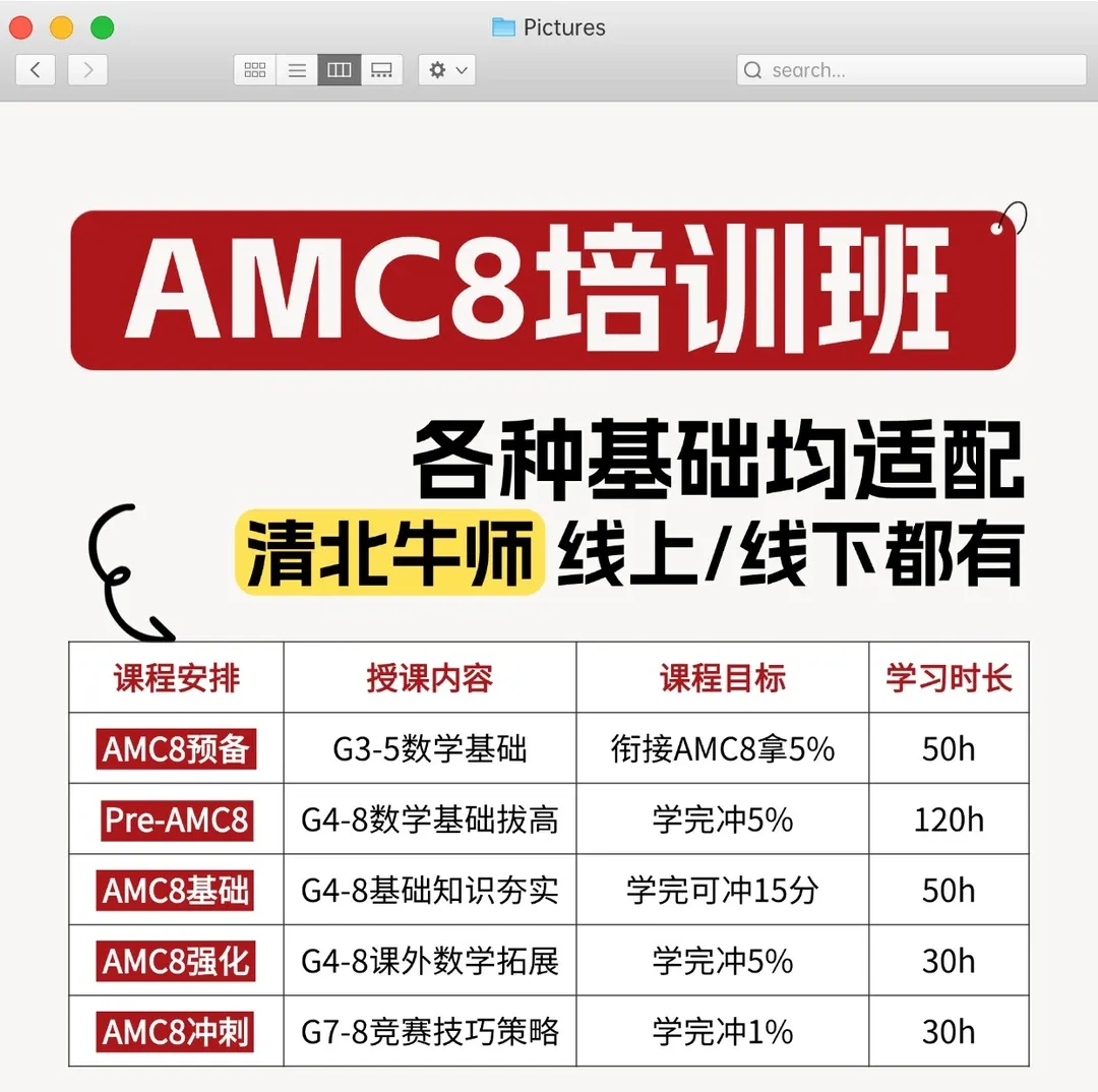 ✨课程班型:Pre-AMC8全程班、AMC8全程班、AMC8基础班、AMC8强化班、AMC8冲刺班