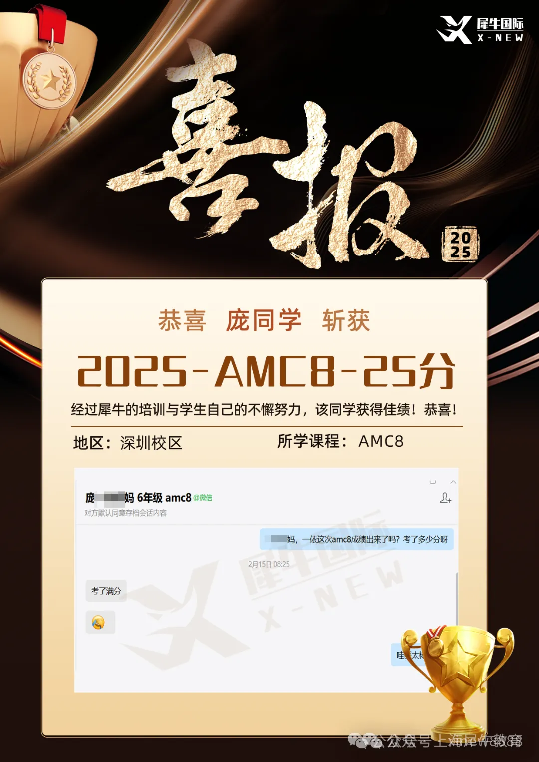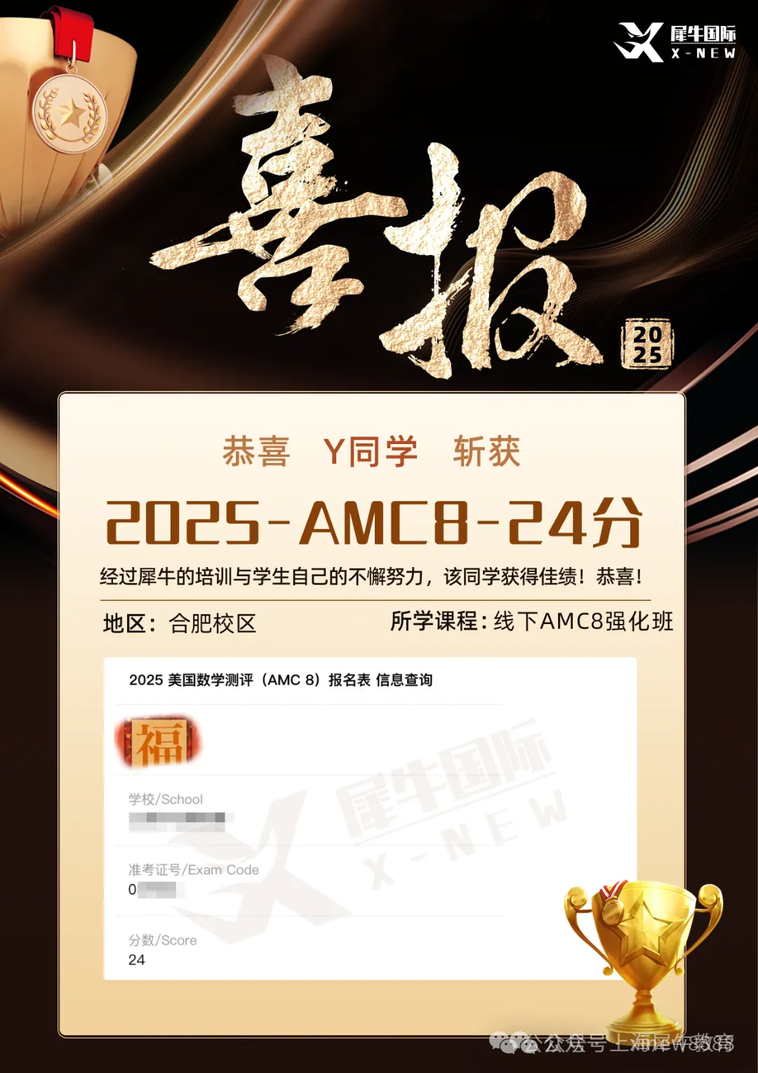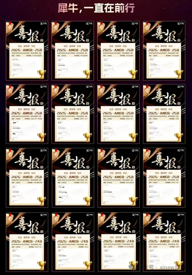 今年犀牛学员斩获AMC8竞赛26名满分奖,今年AMC8获奖率趋近于99%,这个在国内是非常厉害的,AMC8培训犀牛非常专业。