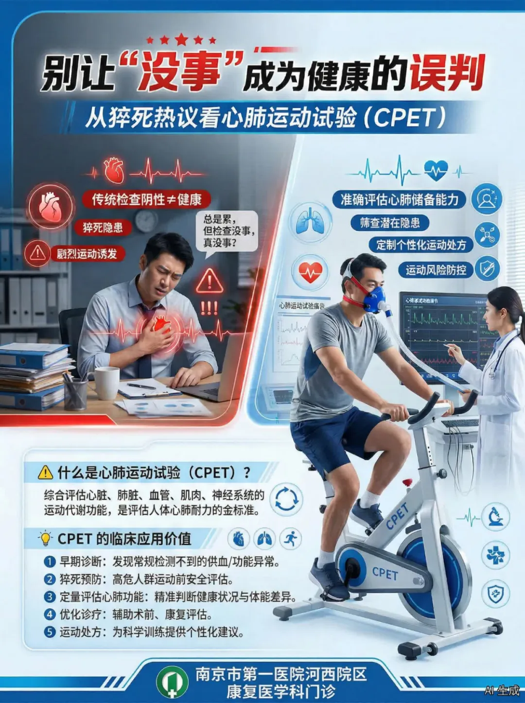 人体在静息状态下(坐着或躺着),对心肺功能的需求很低,许多潜在的疾病(如隐匿性冠心病、心律失常、早期心衰)会被掩盖。只有通过“一定强度运动”,给身体增加负荷,心肺系统的薄弱环节才会显露出来。