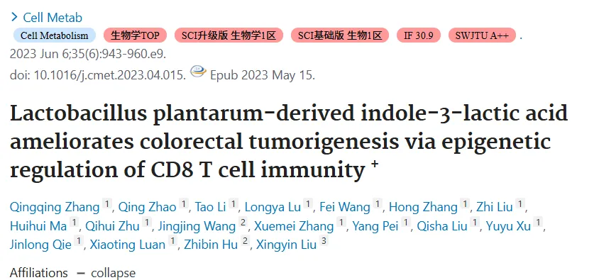 标题:植物乳杆菌来源的吲哚-3-乳酸通过表观遗传调控CD8+ T细胞免疫改善结直肠肿瘤发生